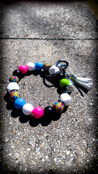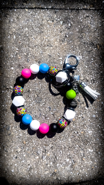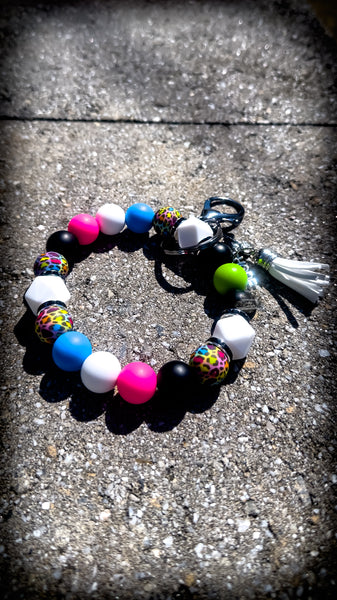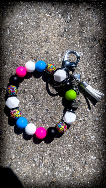 β¨π Add wild, vibrant energy to your everyday carry with the Color Pop Safari Silicone Beaded Wristlet! Featuring a playful mix of hot pink, bright blue, lime green, crisp white, and black beads with bold rainbow leopard print accents ππ, plus modern white geometric focal beads and a sleek white tassel charm. This wristlet is fun, practical, and durable β perfect for keys, fobs, or small accessories while making a fashion statement.