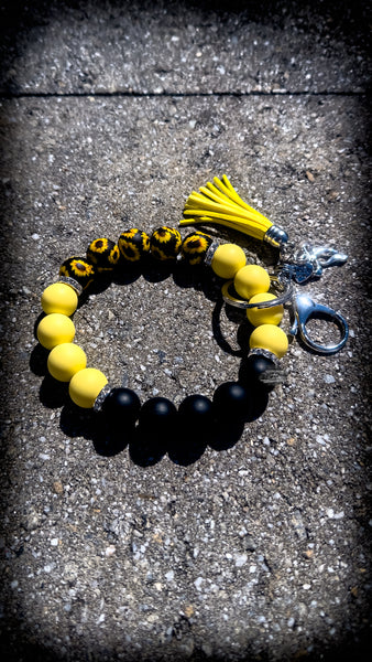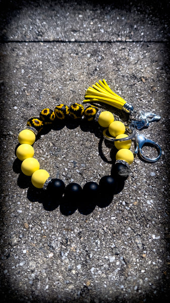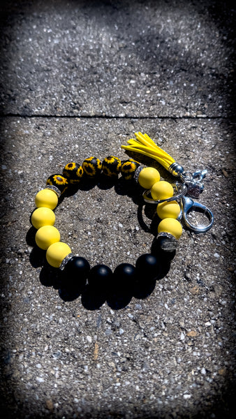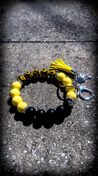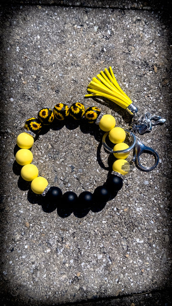 Brighten your day and keep your hands free with the Golden Sunflower Silicone Beaded Wristlet β a cheerful mix of sunny yellow, deep black, and detailed sunflower print beads. Finished with sparkling silver accent rings, a durable swivel clasp, and a bold yellow tassel for the perfect finishing touch. Handmade and strung on durable nylon cord (not elastic) so itβs built to last while keeping your essentials close in style.