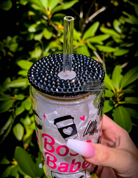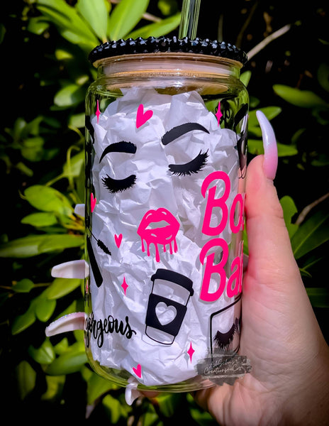 Calling all glam girls, lash techs, coffee lovers, and boss babes! 💅☕ This 16oz glass can tumbler is the ultimate accessory for your hustle-filled mornings and makeup-fueled dreams. With hot pink Boss Babe lettering, fierce lash graphics, iced coffee icons, and a rhinestone lid that brings ALL the sparkle—you'll feel unstoppable with every sip.