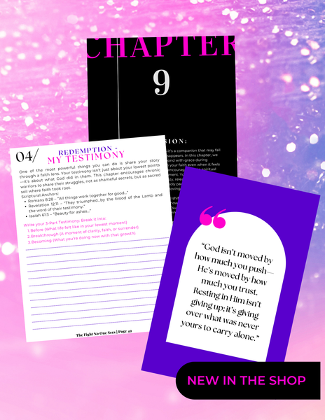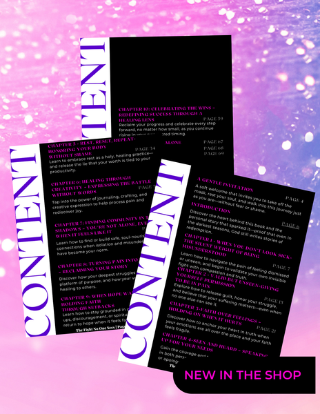The Fight No One Sees is a digital eBook for anyone navigating the quiet storms of life—chronic illness, trauma, burnout, emotional overwhelm, and invisible battles that most never see. Written with raw honesty, redemptive hope, and anchored faith, this ebook is your gentle companion through the valleys—reminding you that your struggle does not disqualify you. It equips you to rest without guilt, speak your truth without shame, and find strength in the shadows through Jesus.