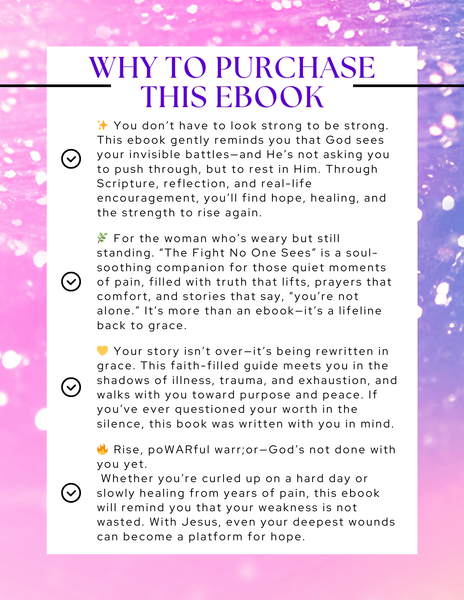 Inside The Fight No One Sees, you’ll find a soft place to land: Scripture-based hope, soul-honest reflections, and the reminder that your pain has not disqualified you—it’s preparing you for purpose. With warmth, humility, and unwavering faith, this ebook walks beside you like a trusted friend, helping you rest in God’s love while reclaiming your strength.