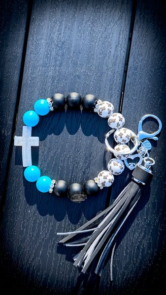 ✝️💙 The Faithful Glow Cross Wristlet combines bold turquoise beads, matte black beads, and white cross-printed accents — all centered around a shimmering frosted cross charm. Perfect for keys, ID badges, church bags, and everyday encouragement!