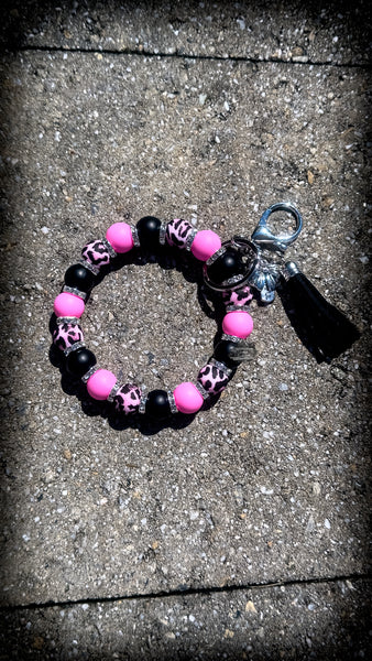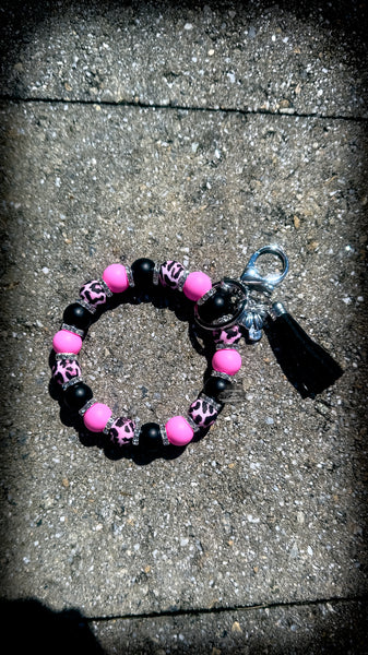 1 Wild Pink Leopard Beaded Wristlet with tassel, keyring & clasp — ready to use or gift