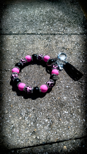 Go fierce and fearless with the Wild Pink Leopard Silicone Beaded Wristlet — a bold mix of hot pink, sleek black, and eye-catching leopard-print beads, finished with sparkling silver accent rings, polished hardware, and a sleek black tassel. Handmade and strung on durable nylon cord (not elastic) so you can carry your essentials with style and confidence.
